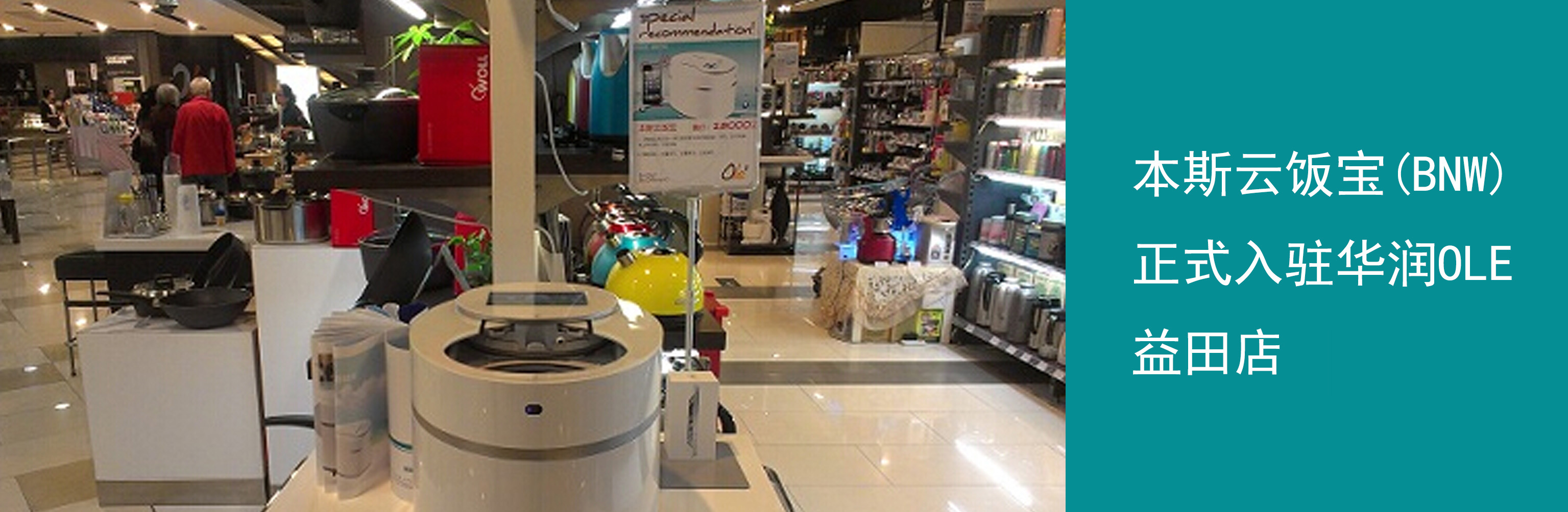 2013年02月01日本斯云饭宝(BNW)正式入驻华润OLE益田店 2013年02月01日,本斯智能电器有限公司与华润万家有限公司达成合作协议,本斯(BNW)云饭宝于当天正式入驻华润万家OLE益田假日店,本次合作的成功达成,为云饭宝进军高端厨房家电市场打响新年的第一炮!本斯电器真诚欢迎新老顾客亲临OLE益田店本斯专柜体验,活动期间买云饭宝送IPHONE5手机!