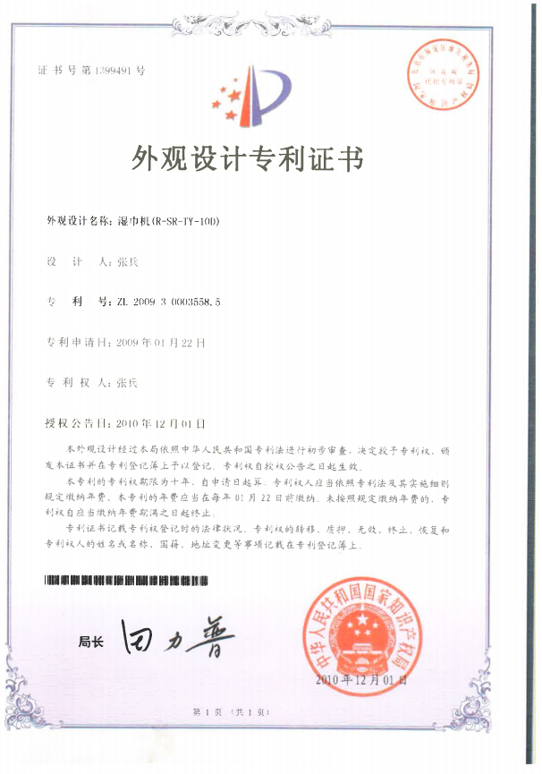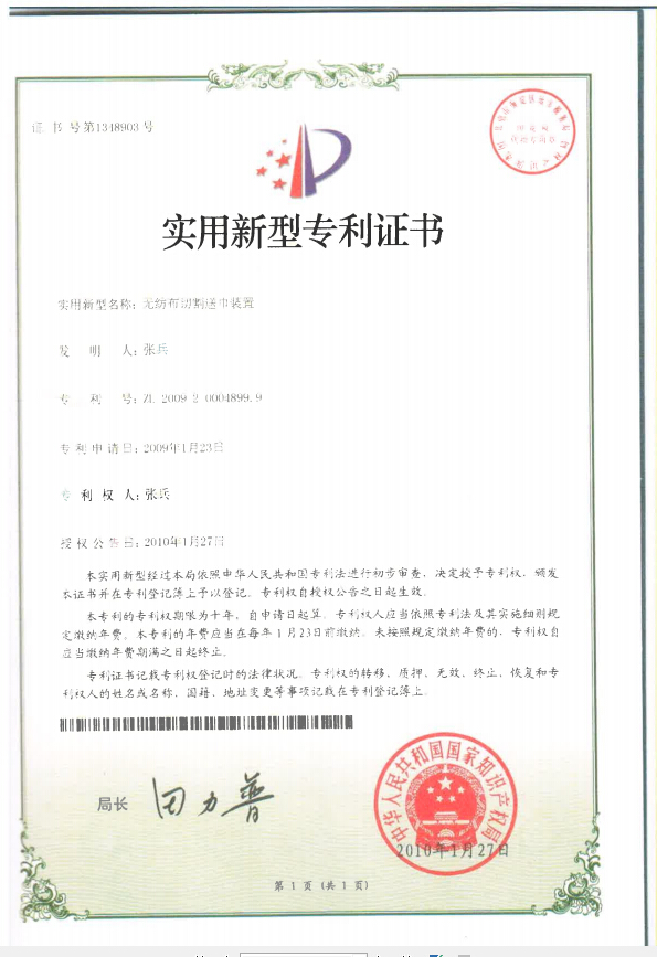 湿巾机专利证书